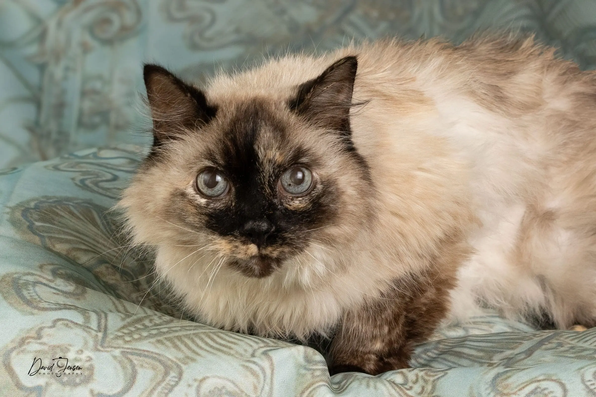Pretty Girl came into our care after her owner died. We were told she was shy, but have found her to be interactive and talkative (as Siamese often are). She is nearly 15 and receiving supportive care for renal failure, so our sanctuary program is perfect for her. If you would be interested in either providing a sanctuary foster home, or adopting with sanctuary support, please reach out to meet this sweetheart! Portrait by David Jensen Photography.